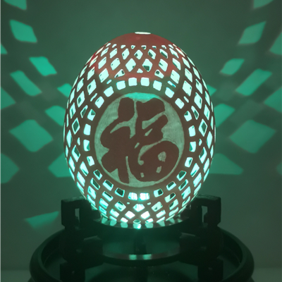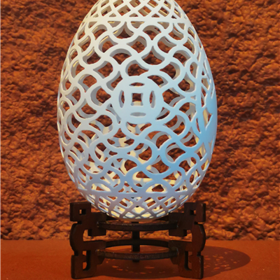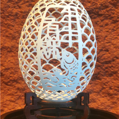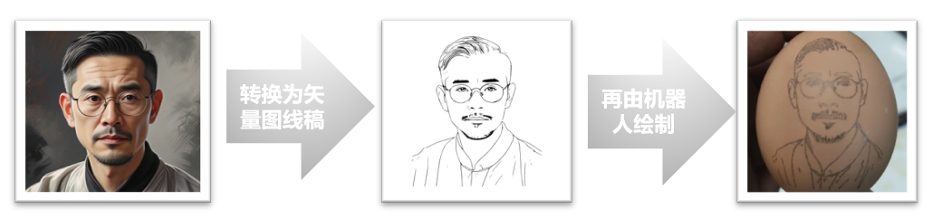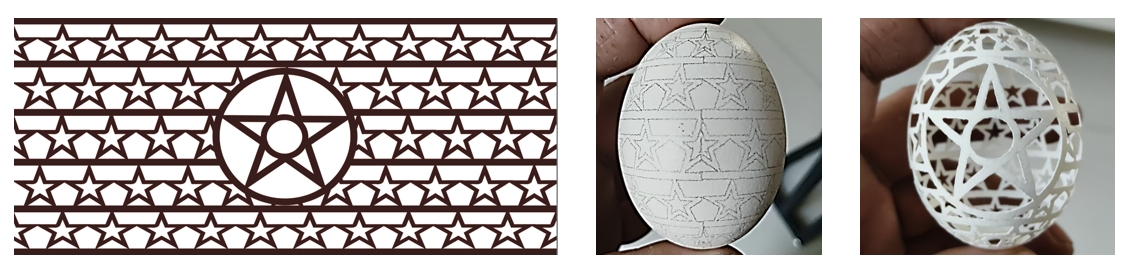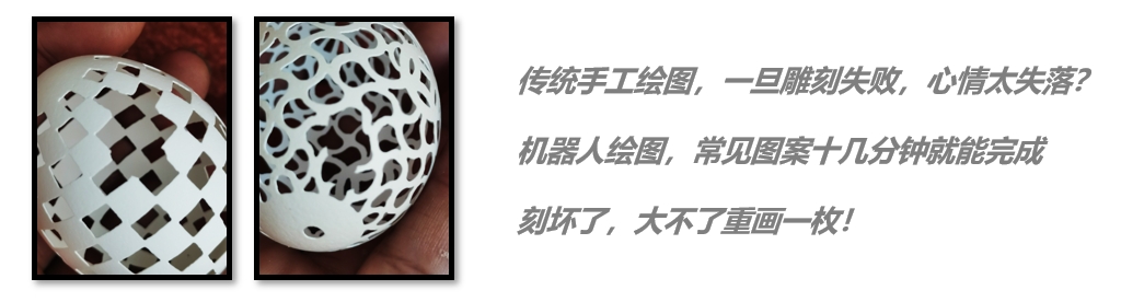 本示例,最左侧为电脑设计的蛋雕图案,中间为机器人使用铅笔绘图效果,右侧为鸡蛋镂空雕刻完成效果