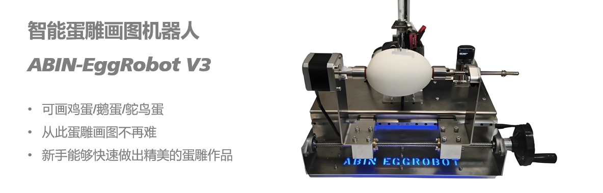 机器人由阿宾老师研发,二十年软硬件开发经验,十余年蛋雕经验,开发的机器人才能真正满足蛋雕爱好者的需求
