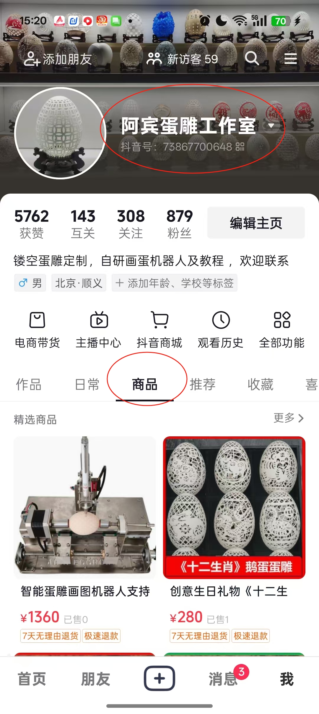 抖音搜索“阿宾蛋雕工作室”,点击商品页,找到画蛋机器人商品并购买,如下图所示: