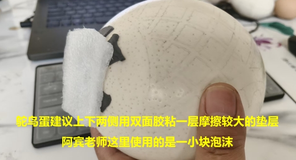 另外,当绘制鸵鸟蛋时,由于鸵鸟蛋重量大,且表皮光滑,如果绘制时旋转过快,可能就会由于旋转惯性导致图形绘制 逐渐错位, 因此鸵鸟蛋绘制建议是:①在机器人设置界面,将电机控制模式修改为鸵鸟蛋模式; ②鸵鸟蛋固定时, 上下两端垫一层摩擦力比较大的垫层,如软泡沫等,并通过双面胶固定到蛋壳上,以便增加摩擦力,如下图: